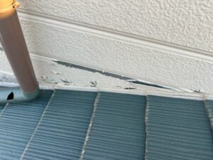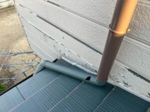 さらに外壁との取り合い部分にも劣化が見られ、雨樋にも割れが確認され、建物全体として経年劣化が進んでいることが分かりました。